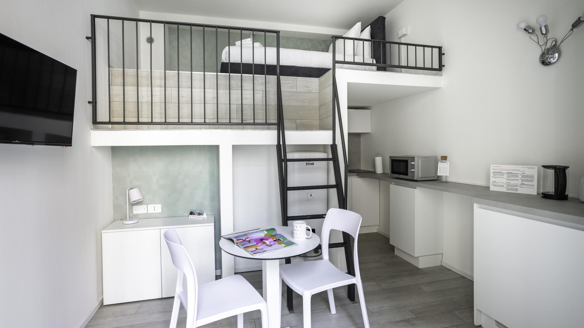 hob and microwave. The sleeping area is equipped with a comfortable single